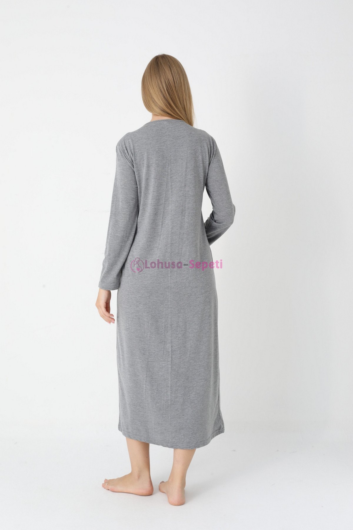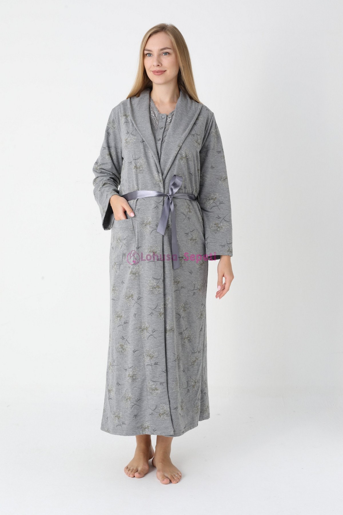 Gri Renkli, Paunatiyeli, Dantel Detaylı, Uzun Kol Erdeniz 2308 Sabahlıklı Lohusa Hamile Gecelik Takım