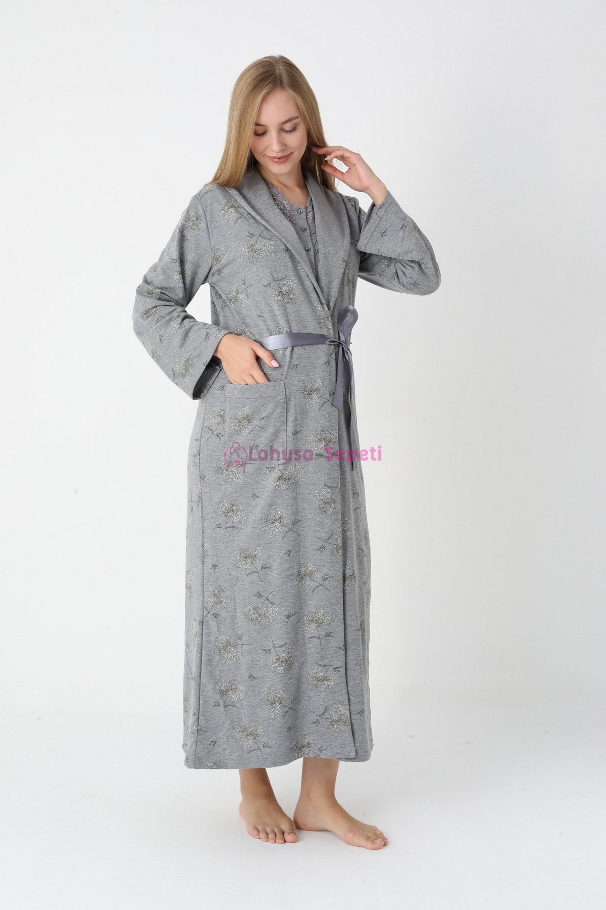 - Ürün İçeriği: Gecelik (düğmeli emzirme özelliği) ve Sabahlık (penye + kuşaklı).