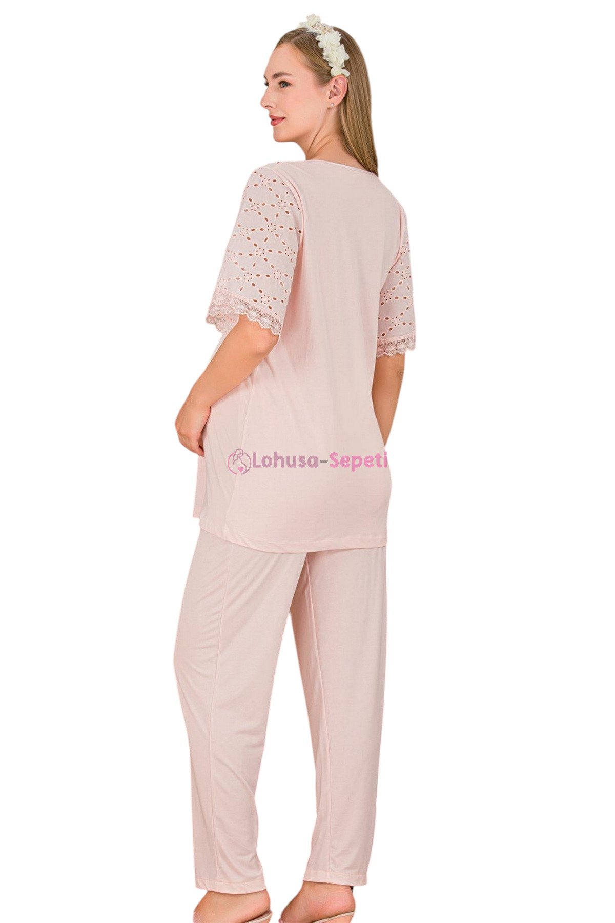 Bebe Pembesi Dantel Detaylı Kısa Kollu Lohusa Pijama Takımı – Kolay Emzirme Özellikli