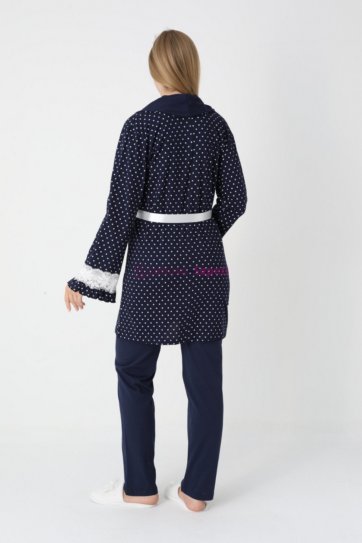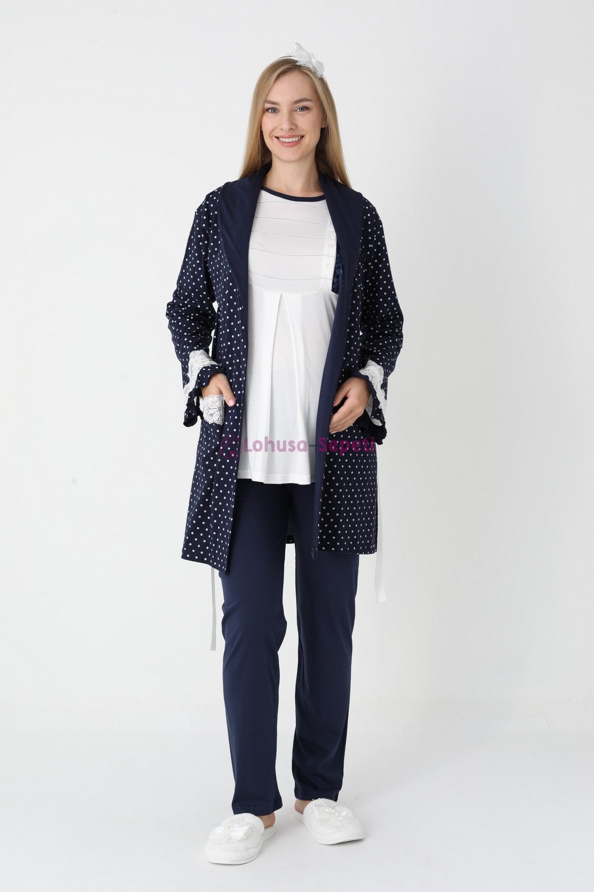 - Zarif Puantiye Desenleri: Modern ve sade puantiye tasarlanan set, lohusa sürecinde kendinizi hem iyi hem de bakımlı hissettirir; doğum çekimleri için harika bir tercihtir.