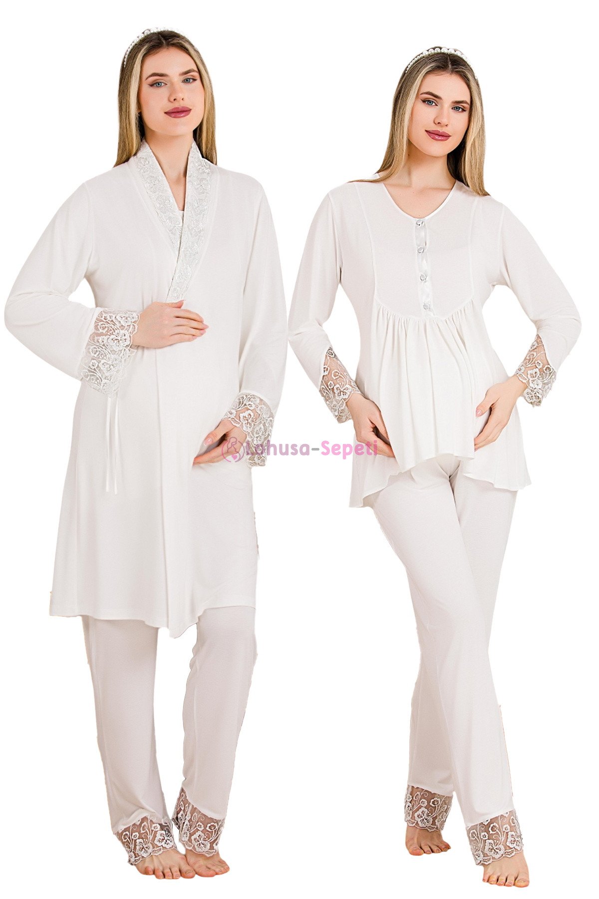 Ekru Renkli Derin Patlı, 33005 Sabahlıklı 3lü Lohusa Hamile Pijama Takımı | Lohusa-Sepeti.com